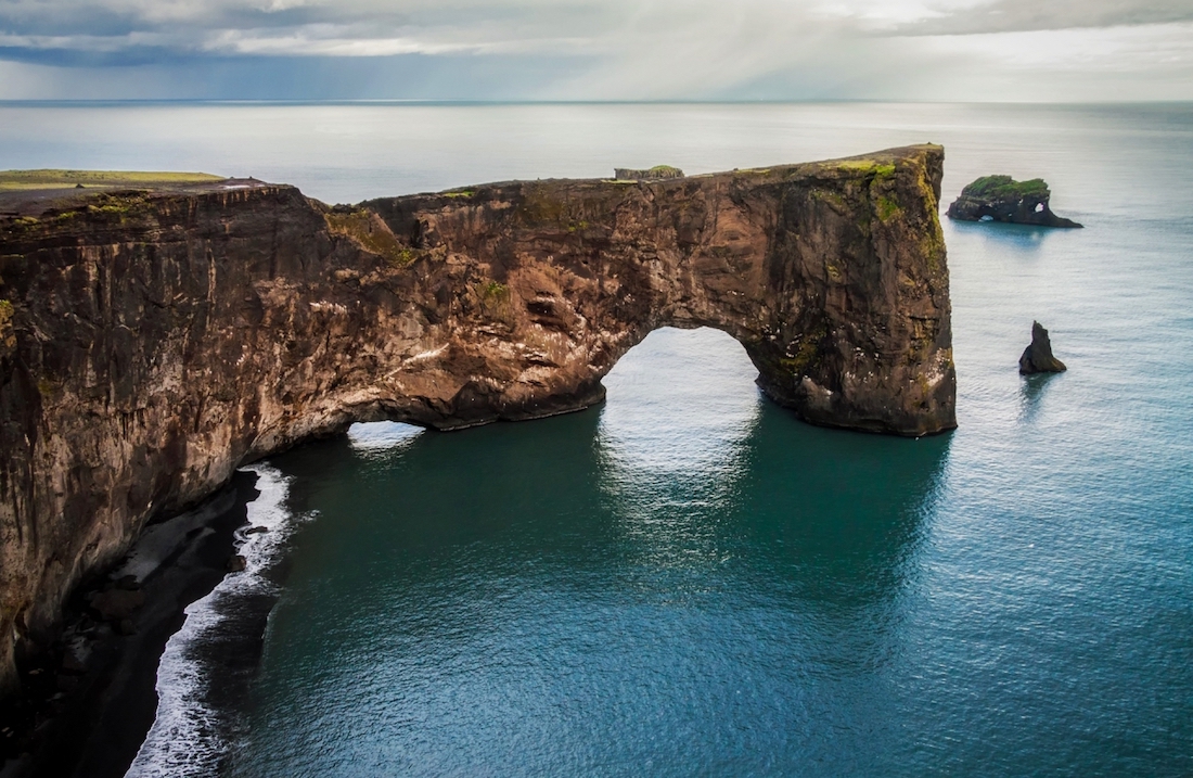 Заповедник Дирхолей — одна из самых красивых природных достопримечательностей Исландии. В переводе с исландского «dyrhólaey» означает «остров с отверстием в двери», что вполне соответствует тому, что вы здесь увидите. На краю черного пляжа с вулканической черной галькой возвышается скала с аркой, под которой даже иногда проплывают катера. Чуть поодаль из воды выходят базальтовые скалы, напоминающие свечки. Любители мифологии говорят, что это не просто скалы, а тролли, которые пытались напасть на проплывающий мимо корабль и не успели скрыться до рассвета, так и окаменели. Как бы там ни было, выглядит это место одновременно и сказочно, и немного пугающе.