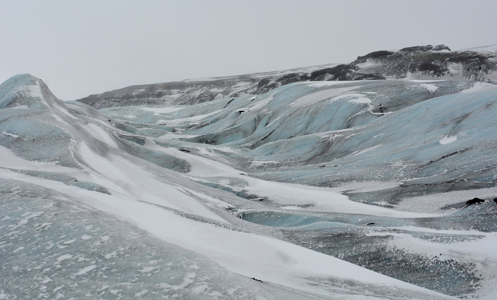 Этот ледник выглядит не так, как мы можем того ожидать — никаких синих ледяных глыб и прозрачных озер. Соульхеймажкютль черно-белого цвета и похож, скорее, на кусок черно-белой халвы с синими прожилками. А все потому что после извержения в 2010 году вулкана Эйяфьядлайёкюдль ледник был засыпан черным вулканическим пеплом. В этом-то и чудо Исландии — то, что издали может выглядеть как груда грязного снега, на деле оказывается вековыми льдами под шапкой из пепла недавно извергавшегося вулкана.