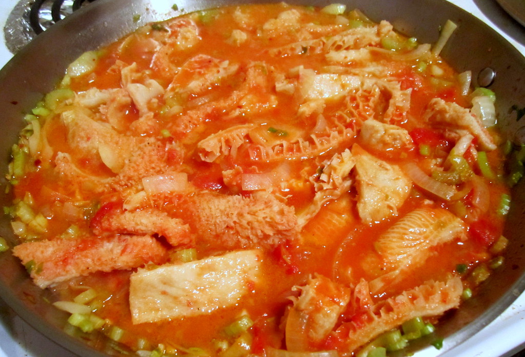 Клецки из картофельного теста и манной или кукурузной крупы, которые сначала варят, а потом тушат с морепродуктами и сливочным соусом.