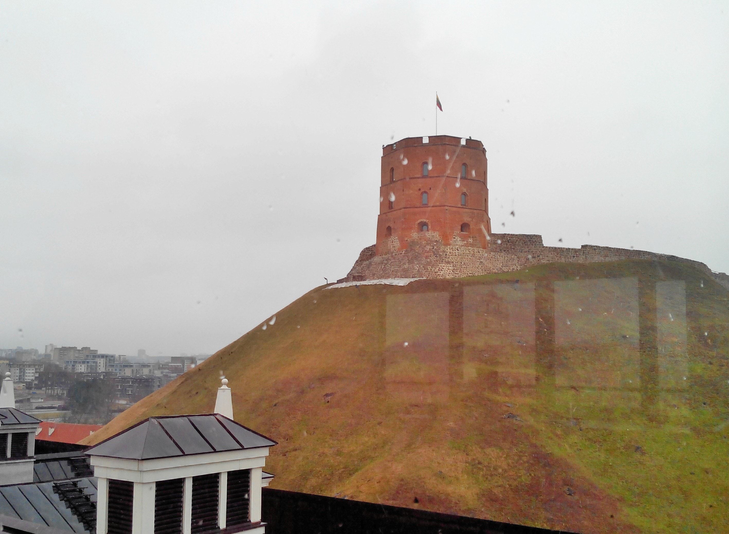 Начните свое путешествие с подъема на самую высокую точку города — холм, на котором построена башня из коричневого кирпича. Подняться на холм можно на фуникулере, на нем же можно спуститься обратно. Любители пеших прогулок обрадуются возможности пройтись пешком по выложенной плиткой дорожке, благо подниматься не очень высоко. С холма открывается потрясающий вид на невысокие домики старого города, на извилистую реку и на вильнюсские небоскребы.