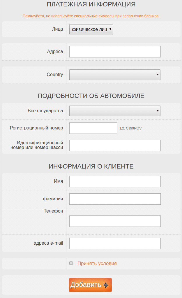На следующей странице вам будет предложено ввести информацию о плательщике: имя и фамилию, страну, адрес, телефон и email; и автомобиле: страну регистрации, гос. номер, номер шасси или VIN-код (последний необходимо указать только при оплате за 30 дней и более); вся информация вводится английскими буквами. В принципе заполнение этой формы не должно составить никаких трудностей, единственно что при указании имени и фамилии может возникнуть проблема в том, что их написание в водительском удостоверении и заграничном паспорте могут отличаться, так и было в нашем случае, поэтому мы писали имя и фамилию так, как написано в загран. паспорте. После того, как заполнили форму, жмите на галочку, что вы принимаете условия и нажимайте «Добавить».
