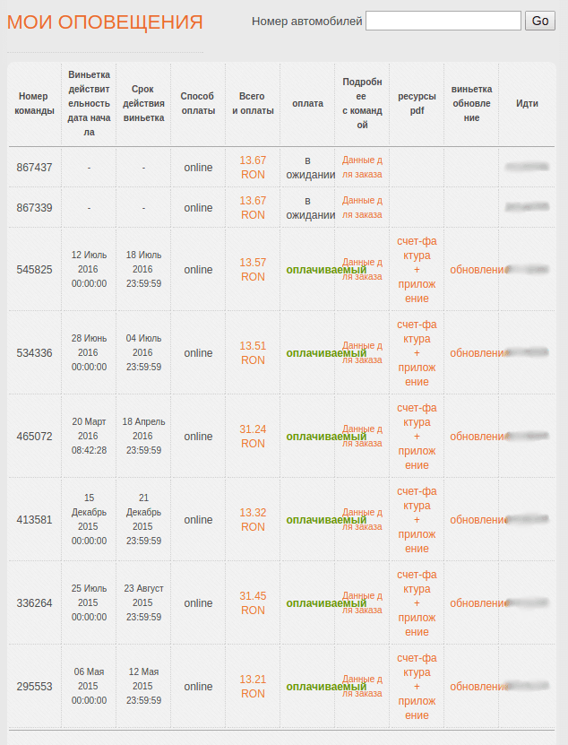После успешной оплаты вы найдете оплаченную Виньетку в вашей учетной записи, если в графе «Оплата / Payment» статус вашей Виньетки будет зеленым цветом с надписью «Оплачиваемый / paid», значит всё прошло успешно.