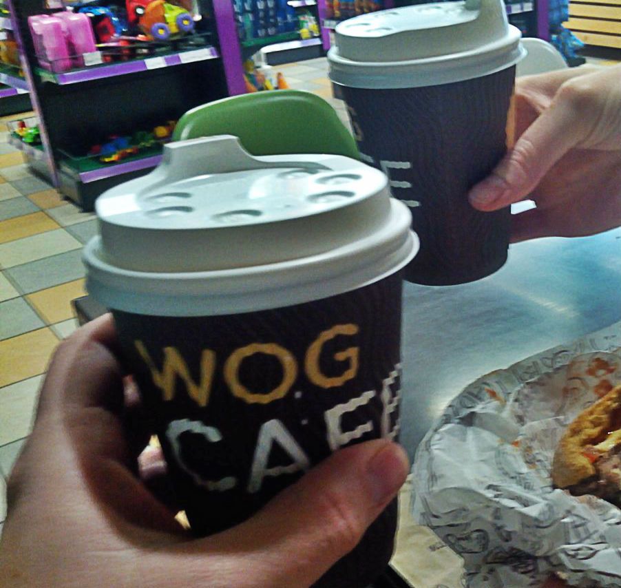 Мы обычно заезжаем на Wog, там и топливо качественное и бургеры вкусные. Часто есть несколько столиков, где можно посидеть, заказ приносят где-то через 10 минут. Приятным бонусом станут безлимитные сливки и ликеры в кофе.